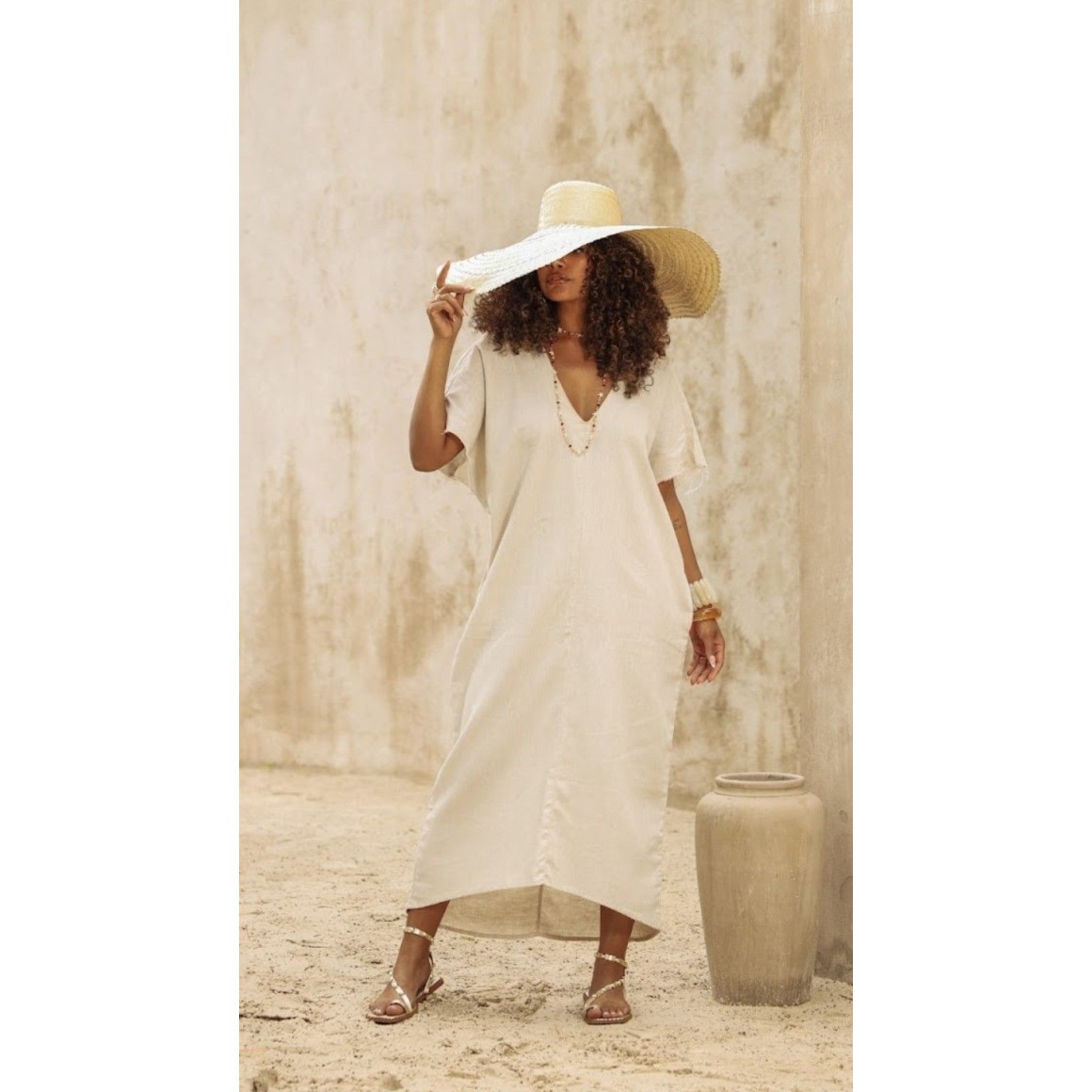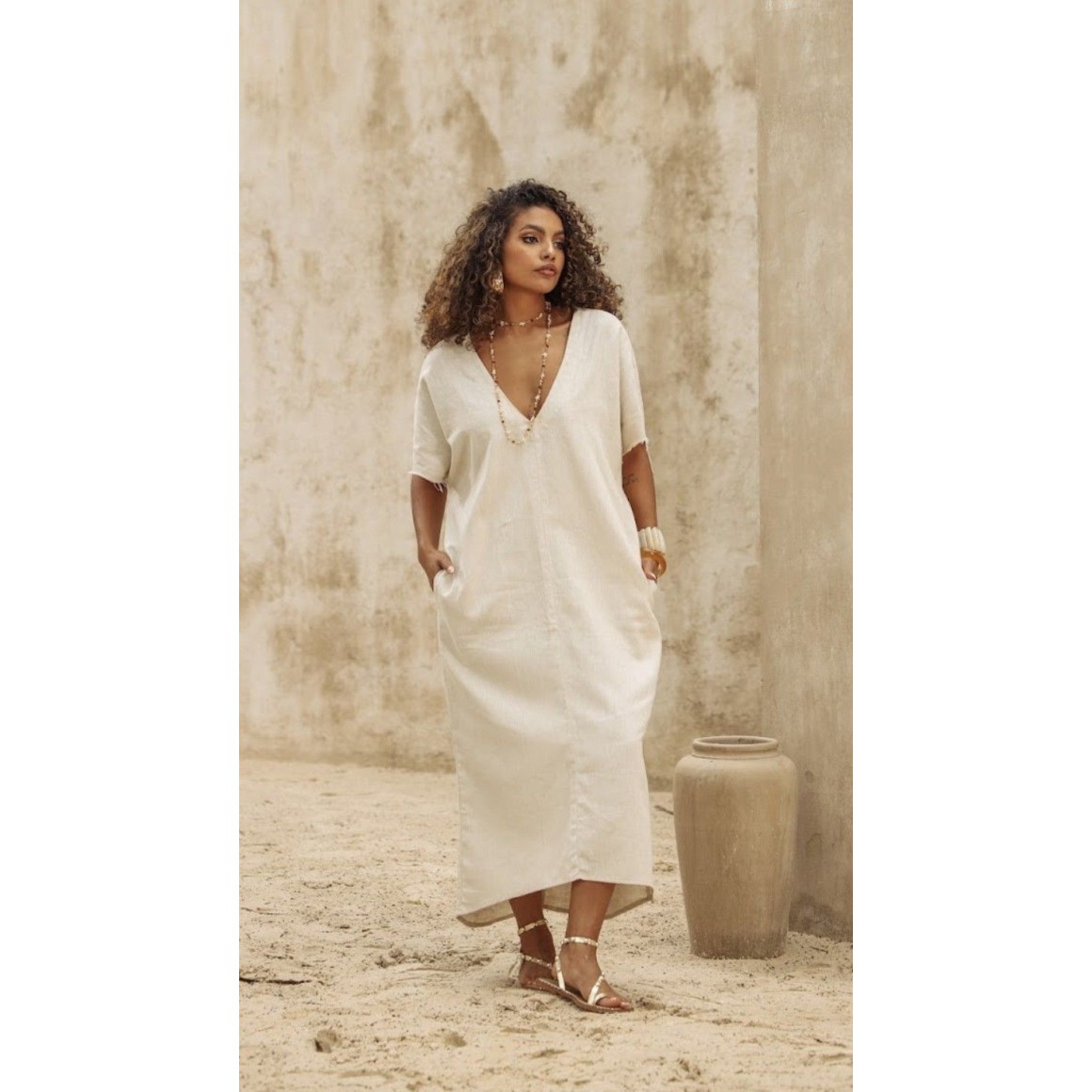 O vestido mullet oversized é confeccionado em tecido de 80% linho e 20% algodão, garantindo leveza, frescor e caimento natural. Seu decote em V valoriza o colo de forma elegante, enquanto os detalhes em corte a fio trazem um toque fashion e despojado.
