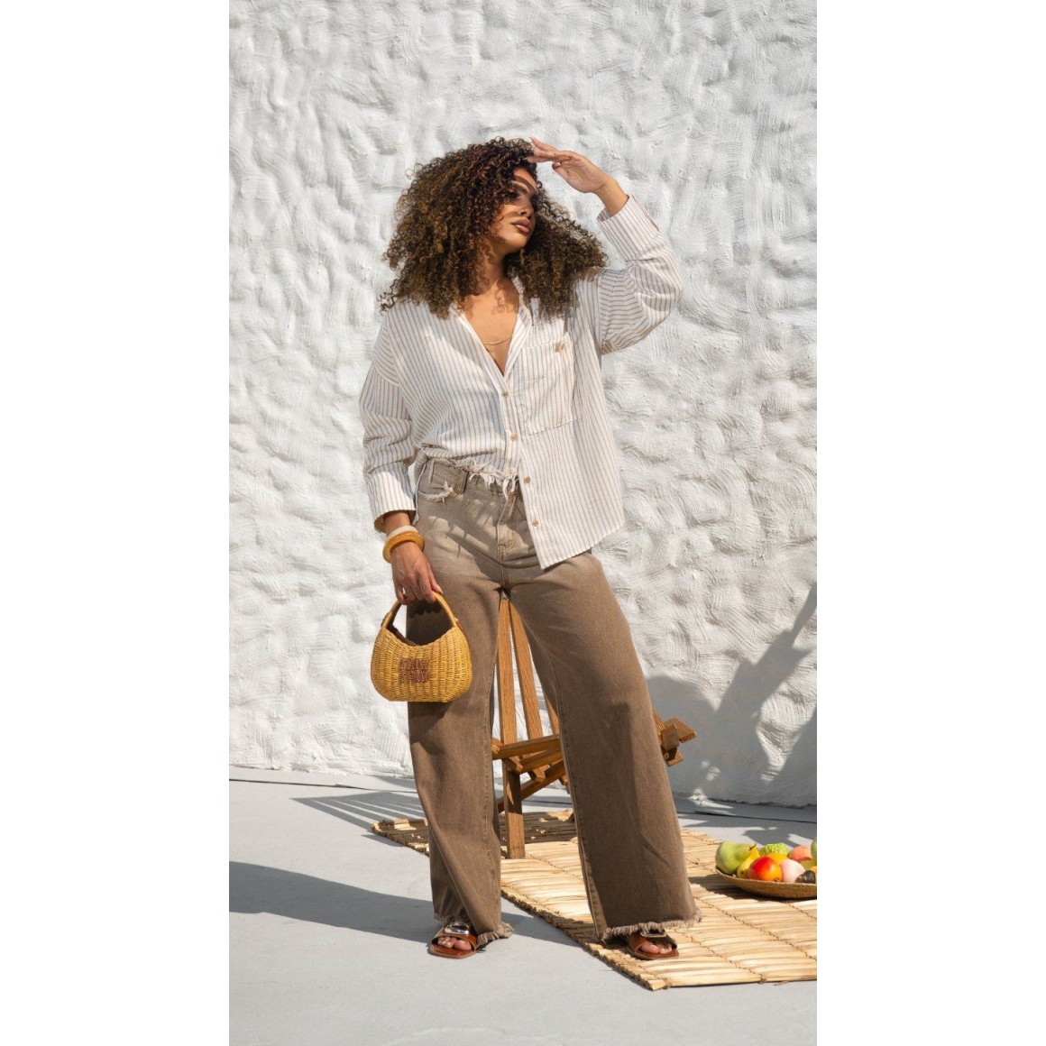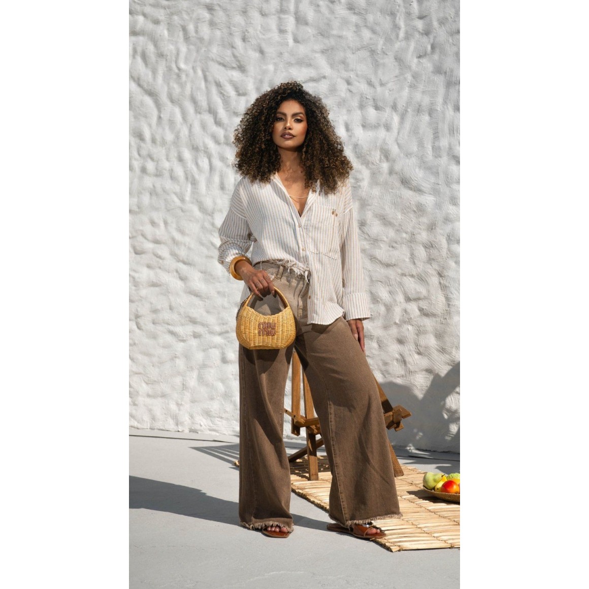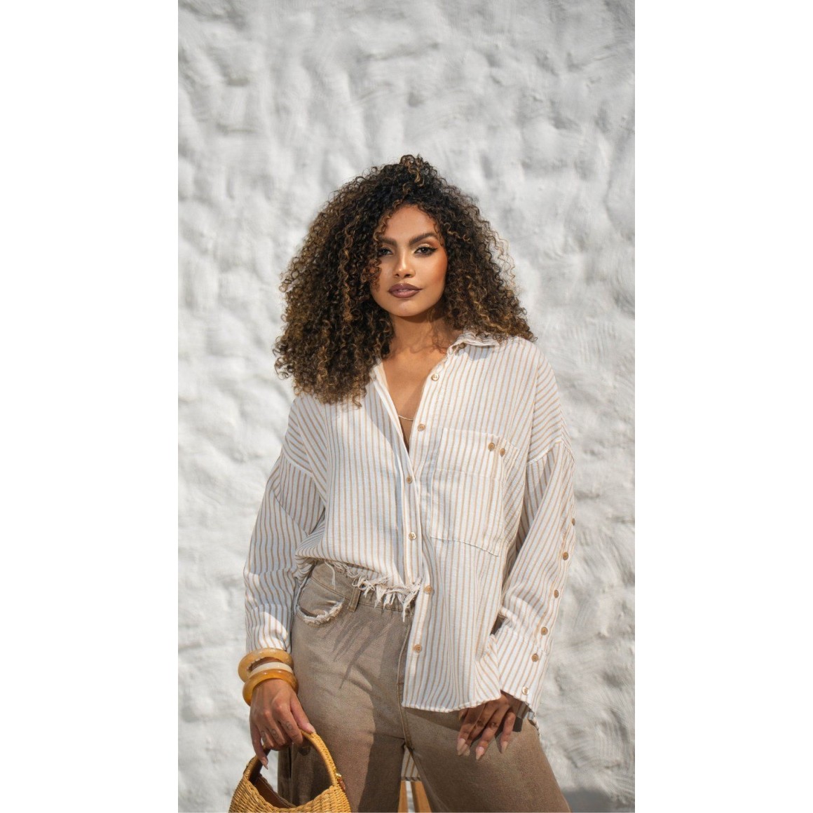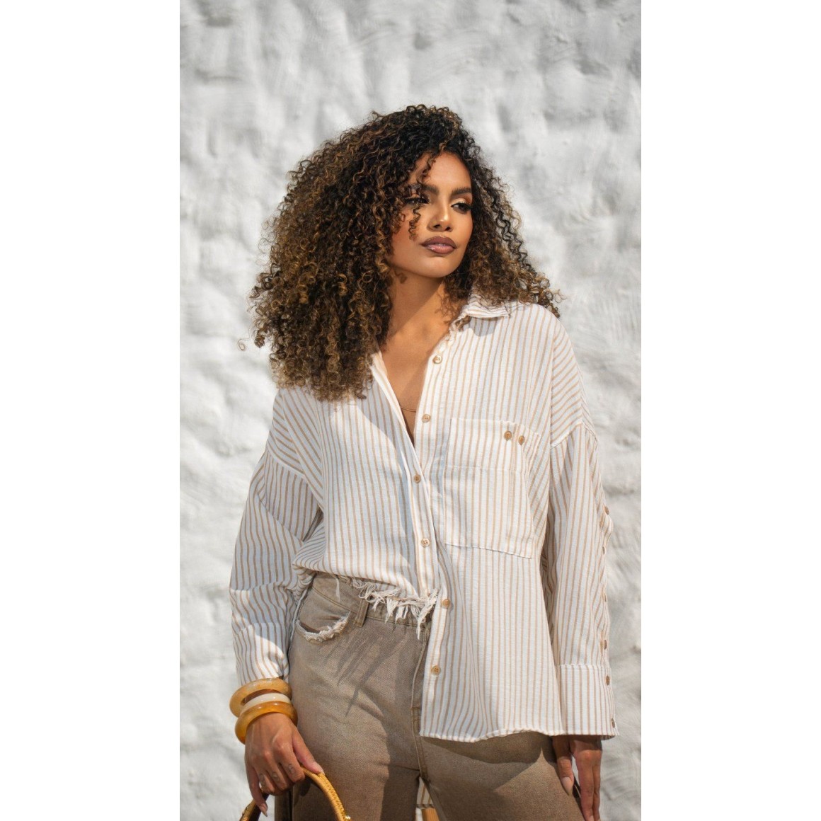 A camisa listrada oversized é a peça-chave da temporada, trazendo o equilíbrio ideal entre estilo, conforto e versatilidade. Confeccionada em 70% poliéster e 30% linho, tem caimento impecável, textura leve e toque sofisticado.