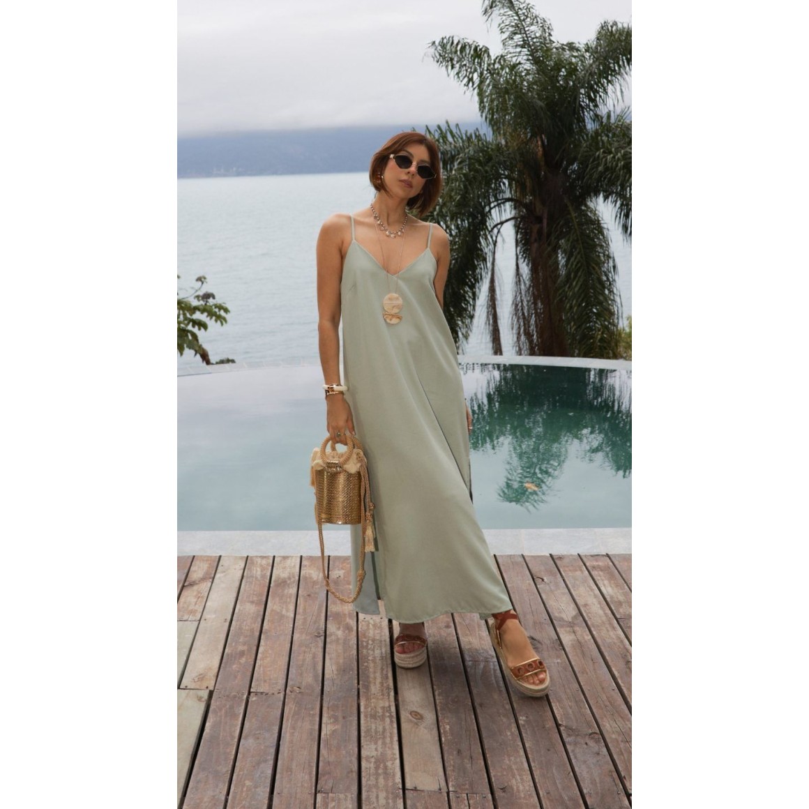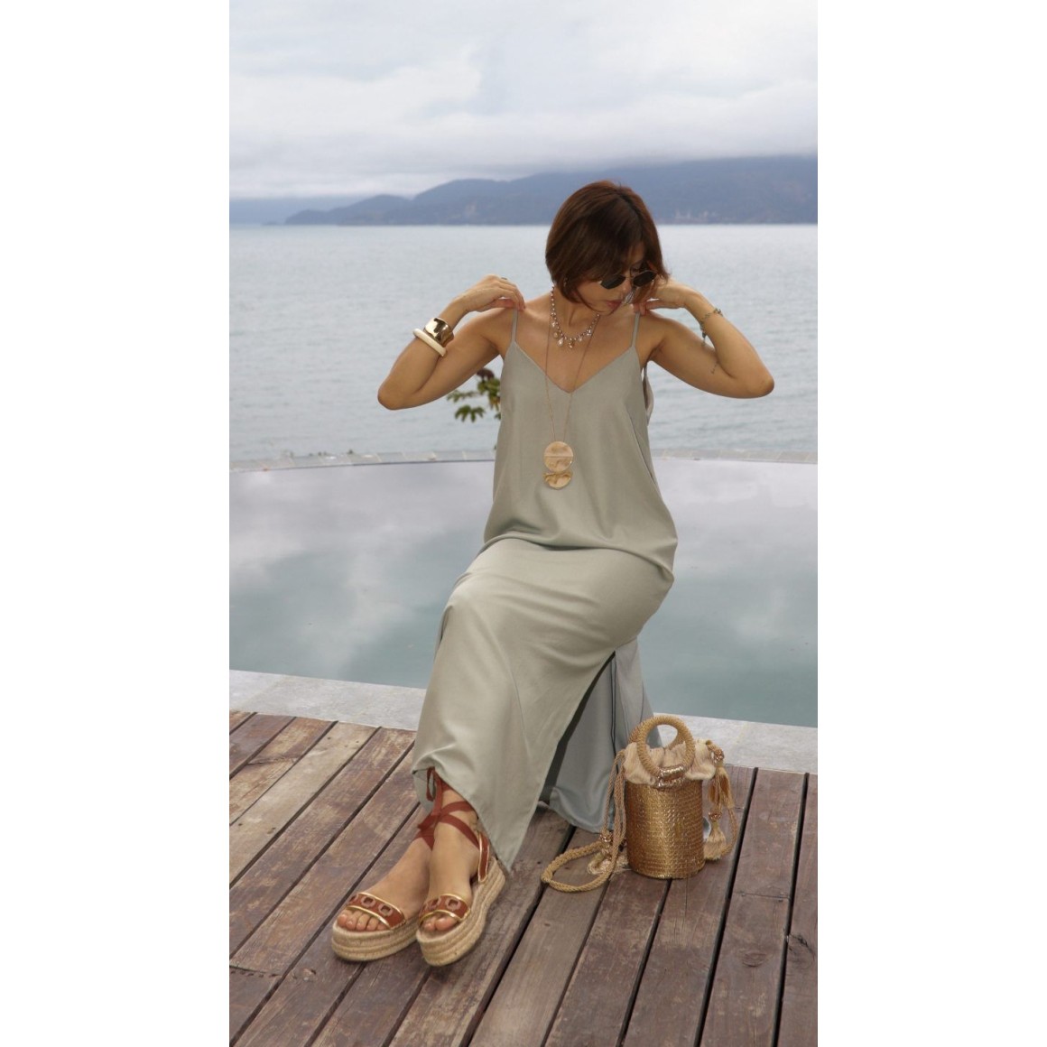 Com decote V na frente e nas costas, o modelo valoriza a silhueta de forma delicada e moderna. As fendas laterais garantem movimento e conforto, tornando a peça ideal para dias quentes ou composições leves e elegantes.