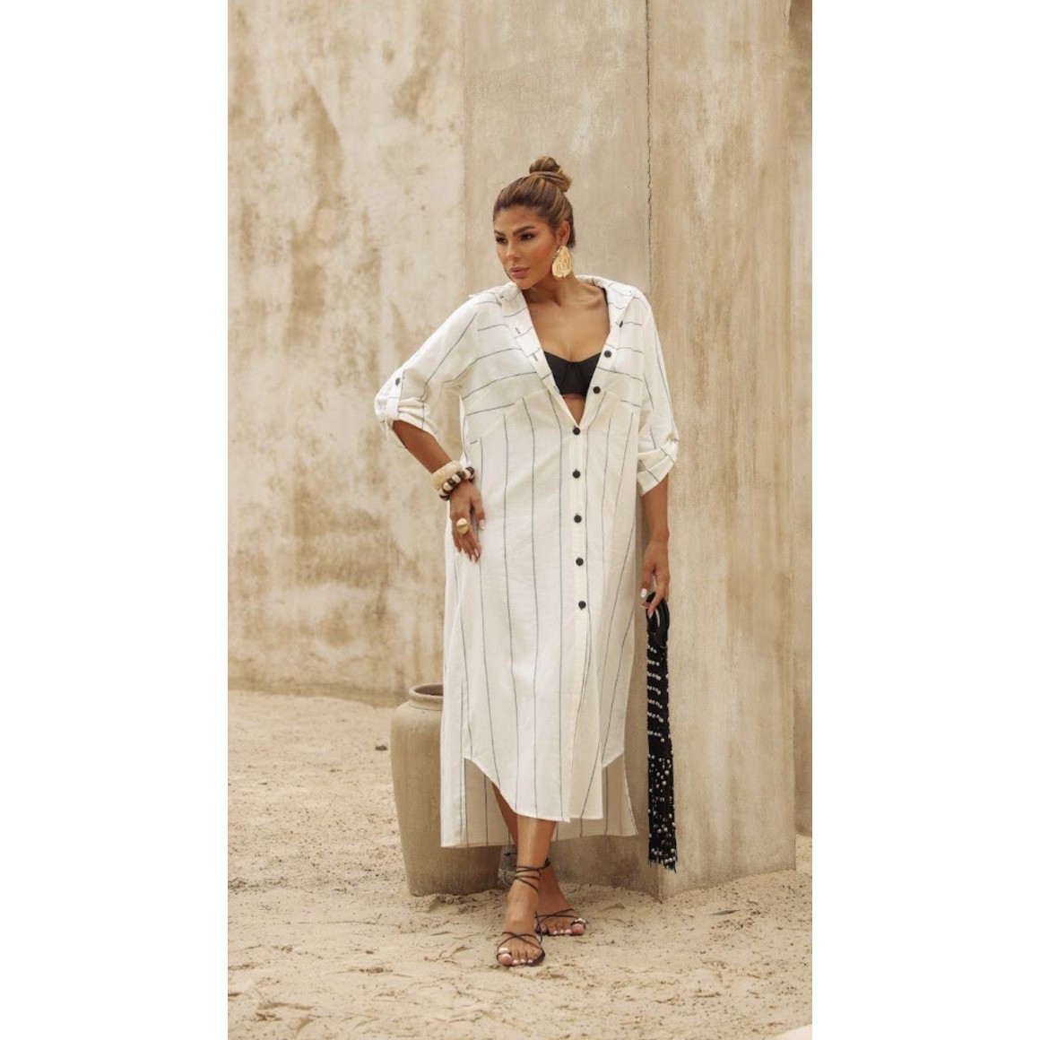 Com corte versátil e alongado, pode ser usada como vestido, sobreposição ou saída, adaptando-se facilmente a diferentes estilos. A gola de camisa italiana traz um toque refinado, enquanto os botões frontais e o martingale nas mangas 3/4 permitem ajustar o visual de maneira prática e elegante. As fendas laterais completam o design, oferecendo movimento e conforto com um toque fashion.