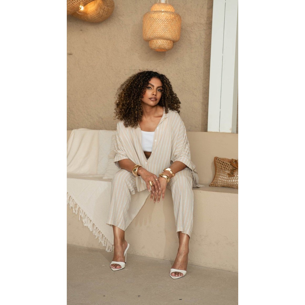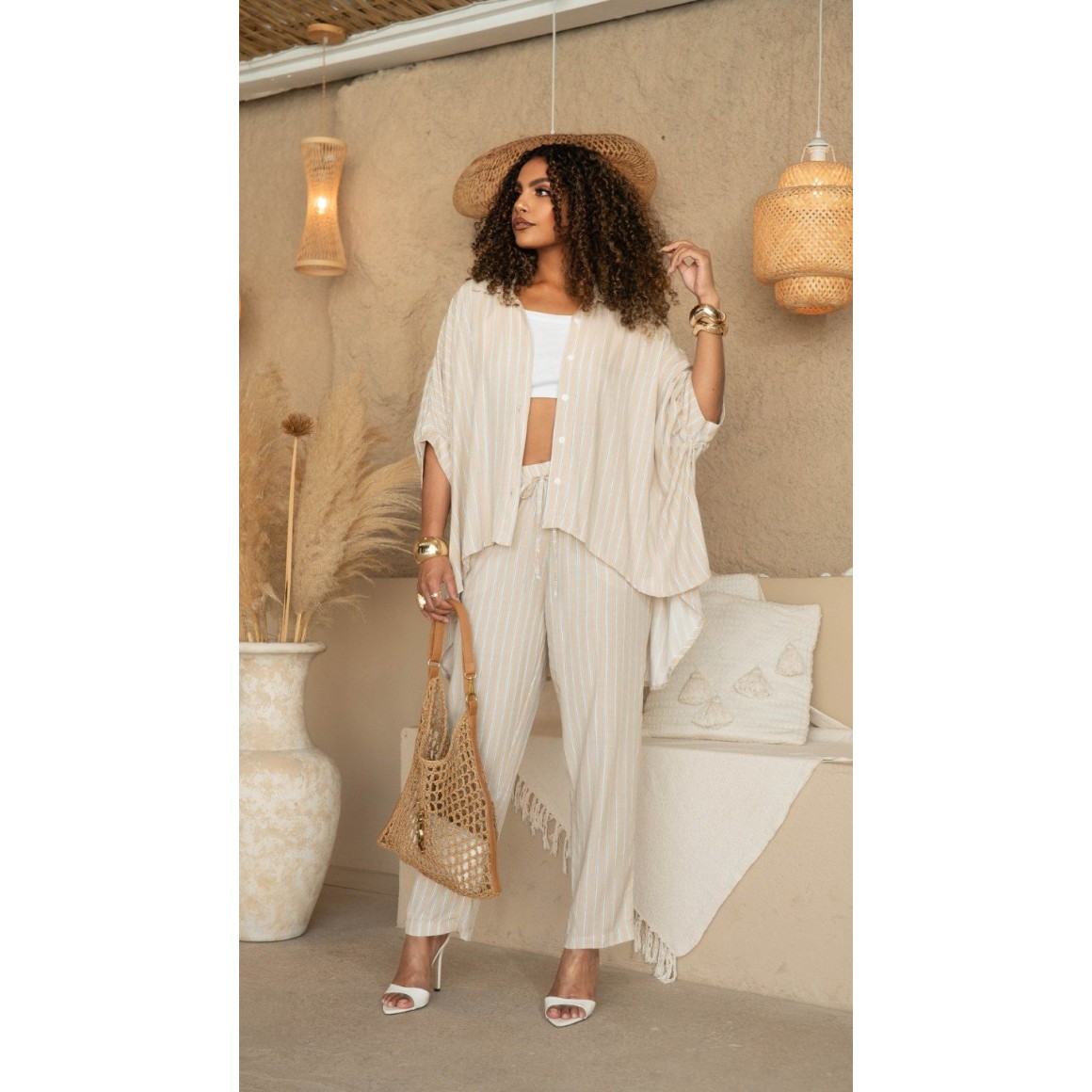 O conjunto listrado é composto por duas peças versáteis e sofisticadas, perfeitas para quem busca elegância e praticidade no dia a dia. Confeccionado em 100% viscose, o tecido leve e fluido proporciona ótimo caimento, movimento natural e conforto absoluto.