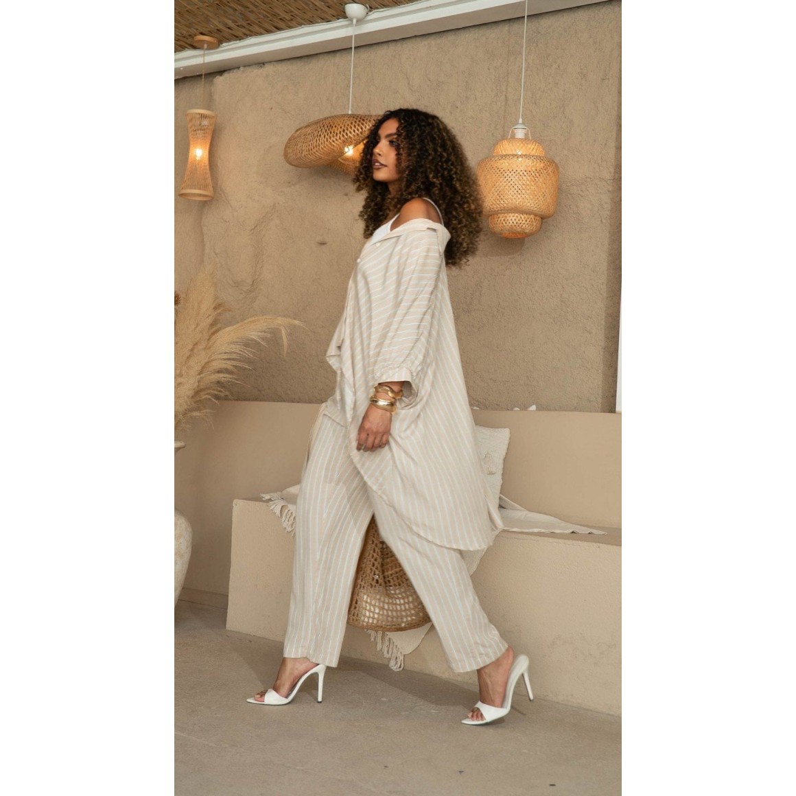 Conjunto Listrado em Viscose com Camisa Oversized e Calça Reta
