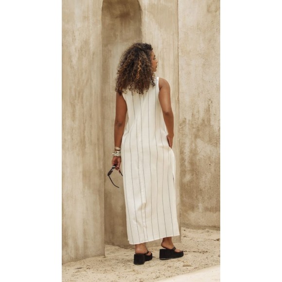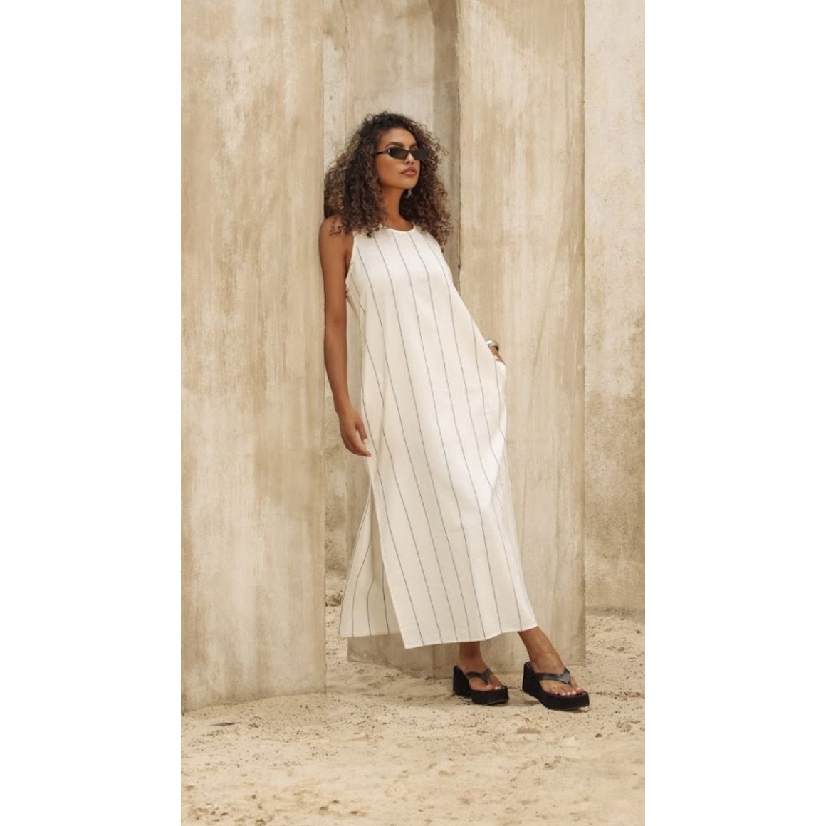 Vestido Longo Regata Listrado com Bolsos Laterais