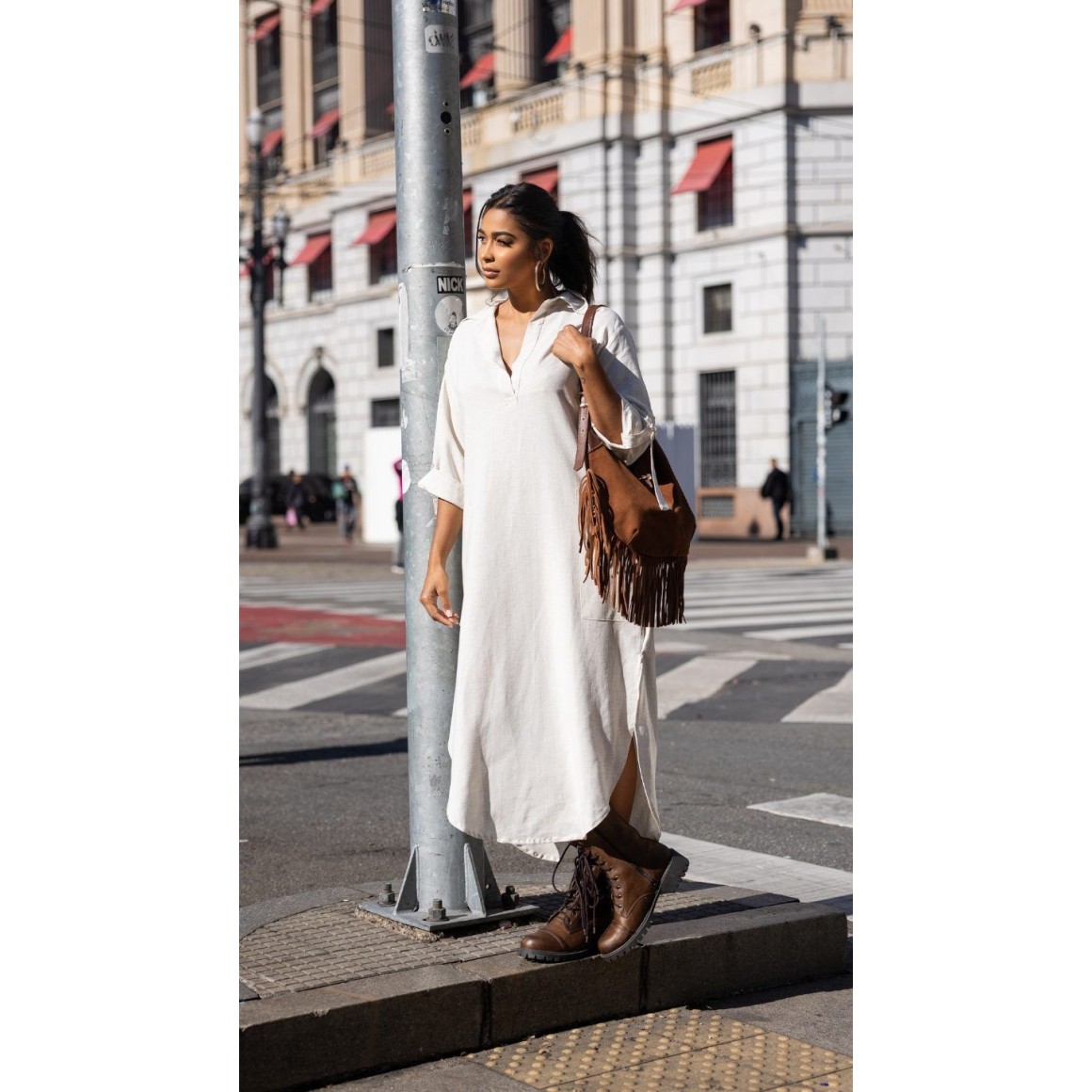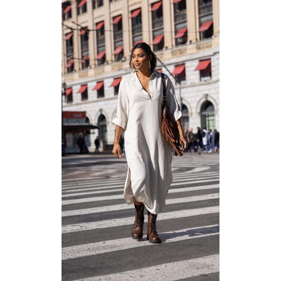 O chemise com gola camisa e decote em V é a escolha ideal para quem busca praticidade sem abrir mão do estilo. Com manga 3/4, bolsos funcionais e barra em corte mullet com fenda, a peça traz movimento e um caimento impecável, perfeito para diferentes ocasiões do dia.